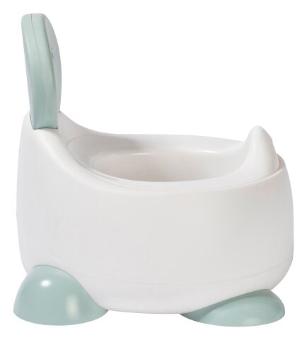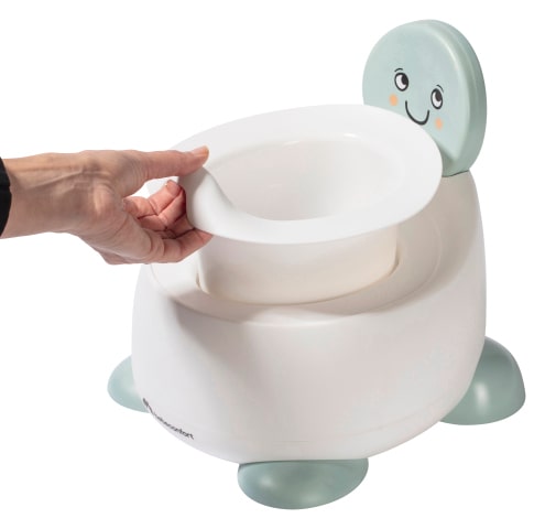 O recipiente amovível do Bacio Confortável com um defletor incorporado facilita o esvaziamento e a limpeza. Os pés de borracha antiderrapantes por baixo das pernas mantêm-no firmemente no lugar enquanto o seu filho o utiliza.