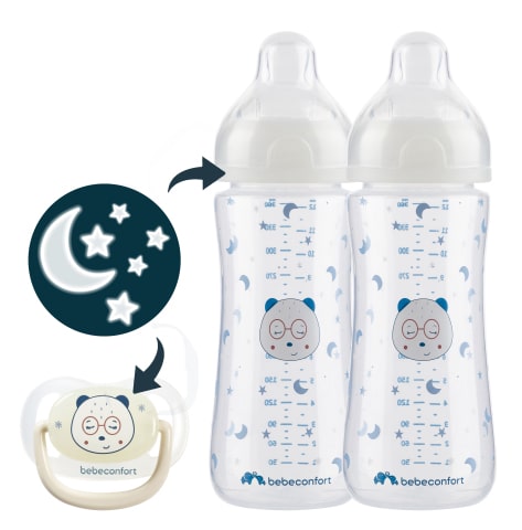 Dois aros que brilham no escuro nos biberões facilitam a alimentação noturna, guiando-o mesmo com pouca luz. Da mesma forma, a chupeta que brilha no escuro é fácil de encontrar na escuridão.