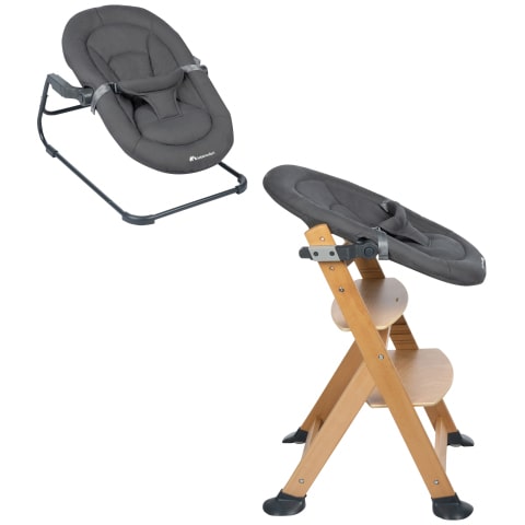 O assento adaptável 2 em1 pode ser instalado na cadeira de refeição Timba, para garantir a diversão durante as refeições em família, antes de ser colocado novamente no suporte da espreguiçadeira.
